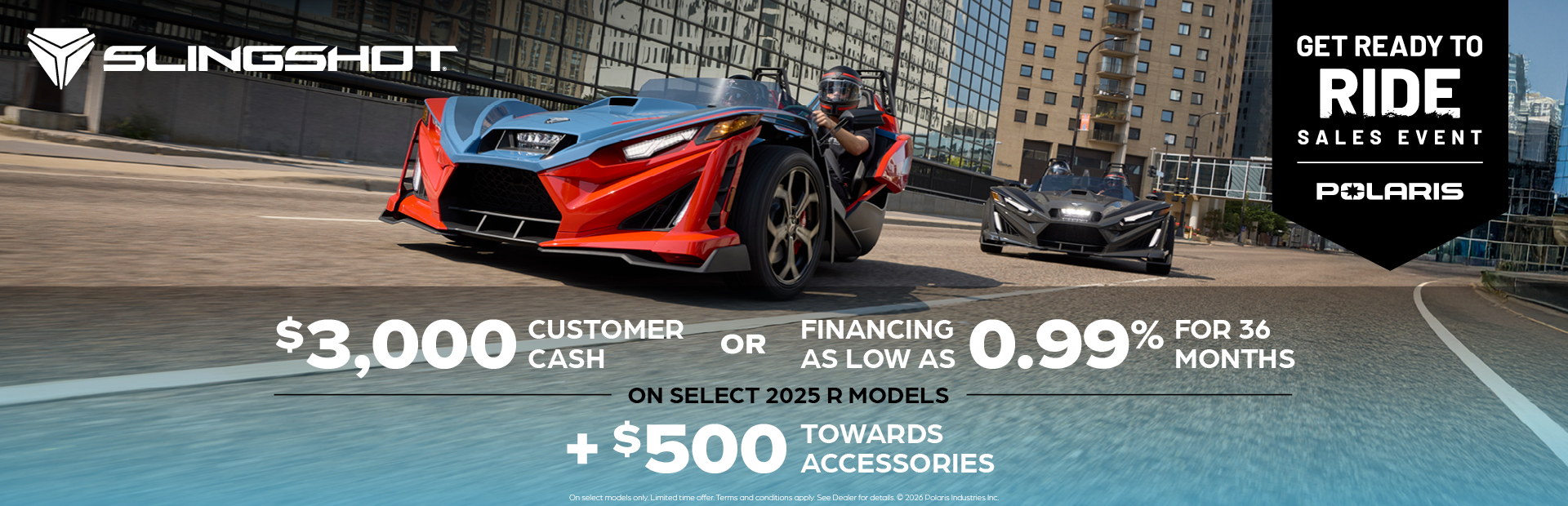 This is a limited time offer which is valid for the purchase of selected qualifying models and is subject to credit approval on qualified purchases financed during this program. Offer may not be combined with certain other offers, is subject to change and may be extended or terminated without further notice. Offer valid on new 2025 Slingshot® models (excluding Slingshot 10). Monthly payment and cost of borrowing will vary depending on amount borrowed and down payment/trade. Minimum amount to finance is $5,000. Example: $28,299 financed at 0.99% APR over 36 months = 36 monthly payments of $718; financed amount of $25,469 with $2,830 down payment, total cost of borrowing of $390 and a total obligation of $25,860. An example of monthly payments required on a 36-month term at 0.99% APR is $28.20 per $1,000 financed. Monthly payment examples assume 10% down and do not include taxes, title, and other fees. Offer only valid to qualified customers, not all customers will qualify, other offers available, see dealer for details. Offer Valid: April 1 – 30, 2026.