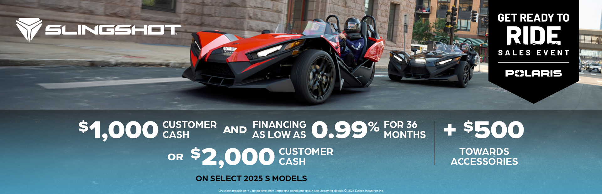 This is a limited time offer which consists of $1,000 Customer Cash rebate towards the purchase of new model year 2025 Slingshot. This offer is subject to change and may be extended or terminated without further notice. Offer may be combined with promotional financing. All rebates paid to dealer and are not redeemable for cash. The $1,000 customer cash offer is specific to the 2025 Slingshot S model. Offer Valid: April 1 – 30, 2026.